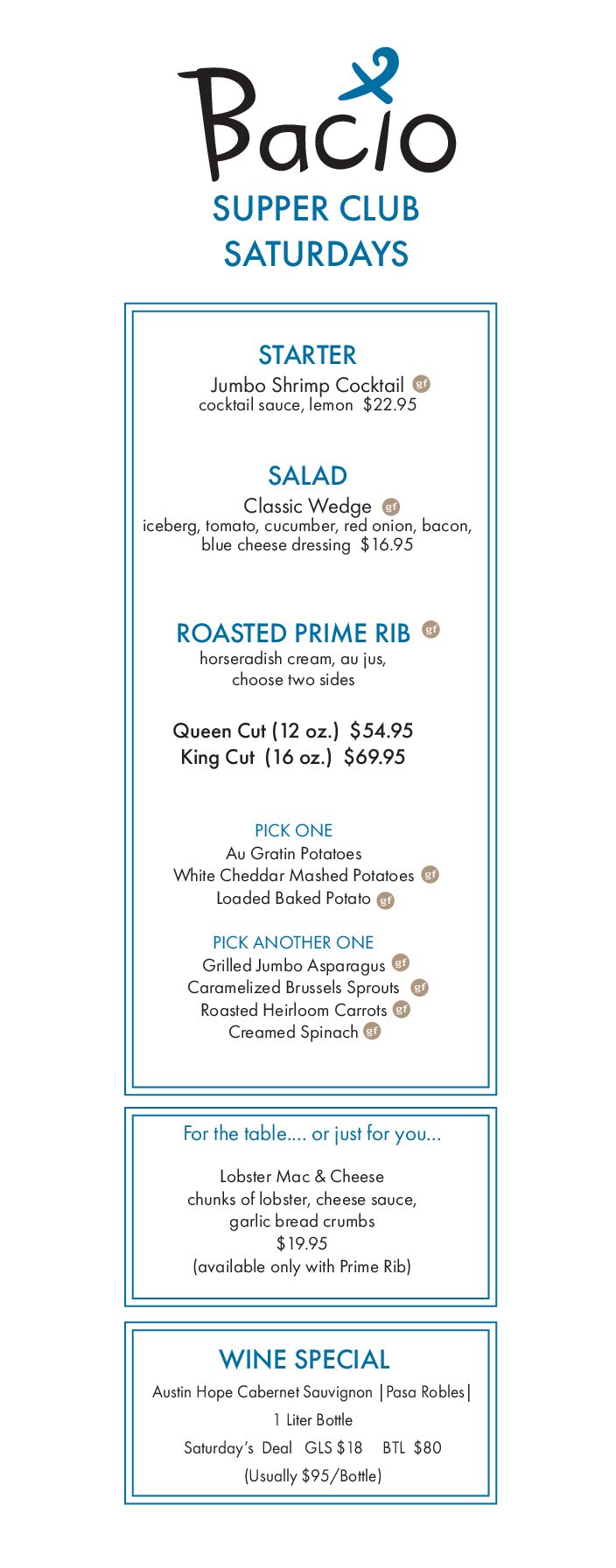 Supper Club Saturday Night at Bacio March 28 @ 4:00 pm - 9:00 pm Supper Club Saturday Night Prime Rib Enjoy our slow roasted [...]